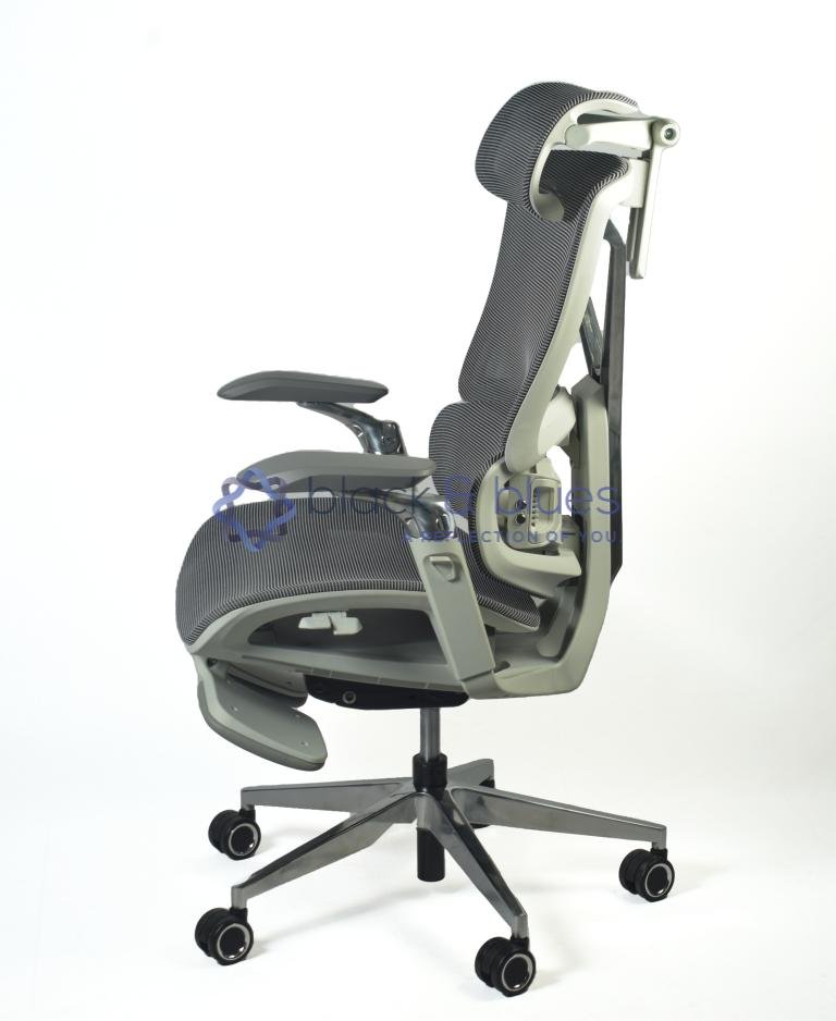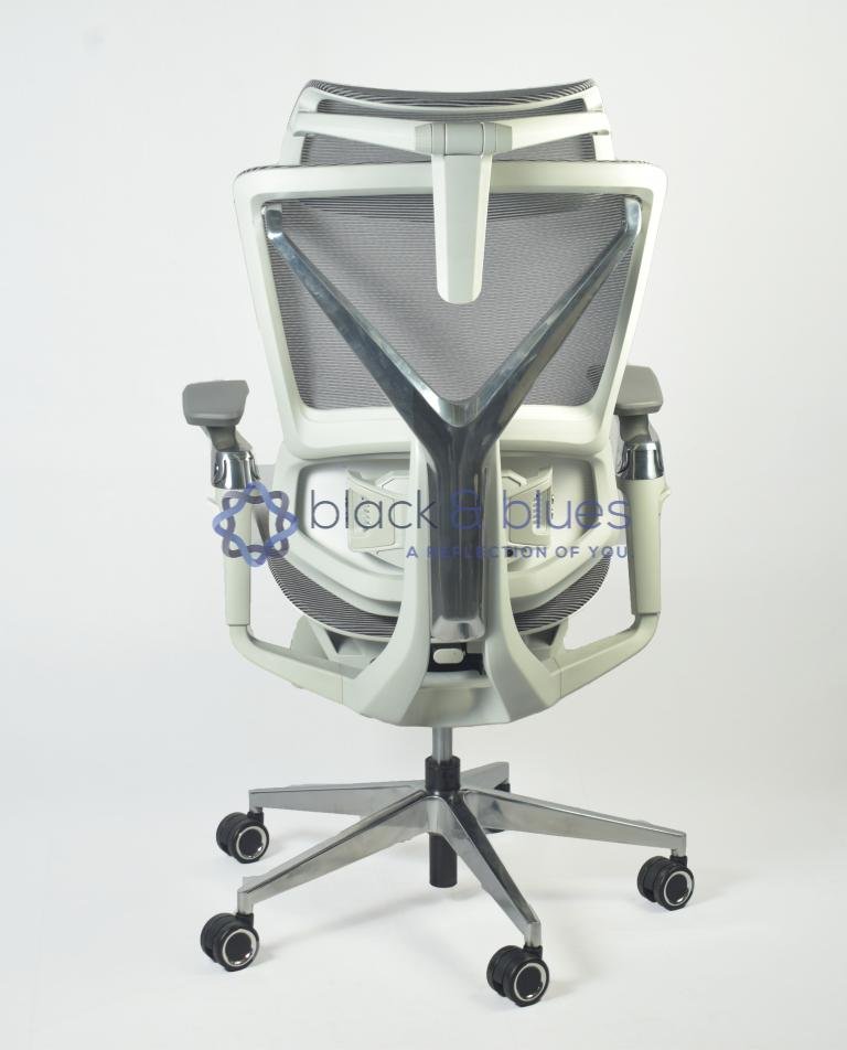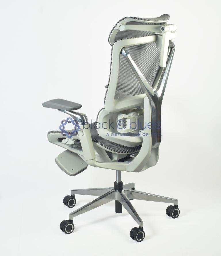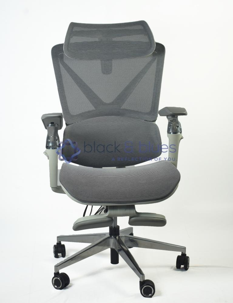 1. HEIGHT ADJUSTABLE GREY NYLON FRAME WITH ALUMINIUM STRUCTURE. 2. HEIGHT ADJUSTABLE HEADREST WITH ANGLE ADJUSTMENT. 3. ADJUSTABLE LUMBAR SUPPORT WITH MASSAGE FUNCTION. 4.ALUMINIUM 6D ARMREST WITH 360 DEGREE ROTATION. 5. MULTI-FUNCTIONAL MECHANISM WITH SLIDER & TENSION CONTROL. 6. CLASS-4 GASLIFT. 7. 350MM ALUMINIUM BASE WITH PU CASTOR. 8. WITH FOOTREST.